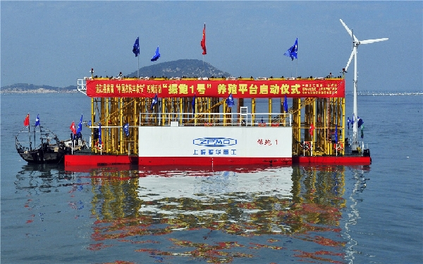 ??? 2018年10月26日上午,全國(guó)首創(chuàng)的深遠(yuǎn)海機(jī)械化養(yǎng)殖平臺(tái)“振鮑1號(hào)”在連江縣苔菉鎮(zhèn)東洛島海域下水啟用。新華網(wǎng)發(fā)(鄭帥 攝)