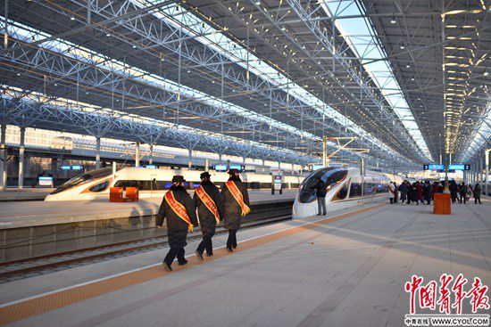 12月30日,北京至張家口高速鐵路開通運營,京張高鐵設計時速350公里,全線設北京北、清河、沙河(不辦理客運)、昌平、八達嶺長城、東花園北、懷來、下花園北、宣化北、張家口10座車站。京張高鐵是我國首條智能化高速鐵路,也是2022年冬奧會的“門戶工程”。北京北站站臺,三名站務人員走向一輛即將發(fā)車的京張高鐵列車。 實習生 宋欣然/攝