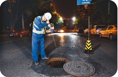 夜間聽(tīng)漏,還有兇險(xiǎn)的時(shí)候。每次在馬路上作業(yè),蔣師傅和同事們都會(huì)把水馬、標(biāo)志燈、閃燈等一一放置好,還有人專(zhuān)門(mén)在旁邊揮舞熒光棒。即使這樣,有一次一輛車(chē)還是直接從輔路沖了出來(lái),把發(fā)電機(jī)都給撞飛了。“挺危險(xiǎn)!現(xiàn)在我們都攔得遠(yuǎn)一點(diǎn),防止車(chē)開(kāi)到跟前才看見(jiàn)我們?!被叵肫饋?lái),蔣師傅依然心有余悸。