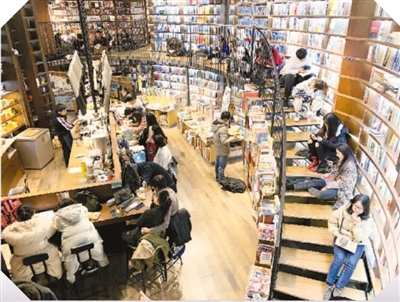 放眼望去,燈火通明的書(shū)店在深夜里依然座無(wú)虛席。有人緩緩踱步,不時(shí)翻翻看看;有人啜著咖啡,面對(duì)電腦手指翻飛。記者沿著樓梯拾級(jí)而上,發(fā)現(xiàn)還有一些顧客或坐或臥,或淺聲交談,或?qū)P拈喿x。