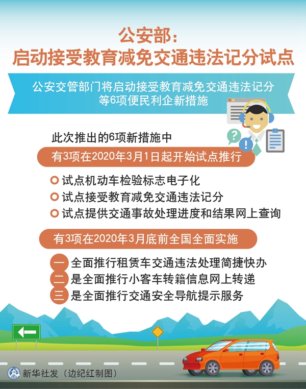 新華社北京1月14日電(劉奕湛、楊凌偉)記者14日從公安部了解到,公安交管部門將啟動接受教育減免交通違法記分等6項便民利企新措施。此次推出的6項新措施中有3項在2020年3月1日起開始試點(diǎn)推行,另有3項在2020年3月底前全國全面實施。