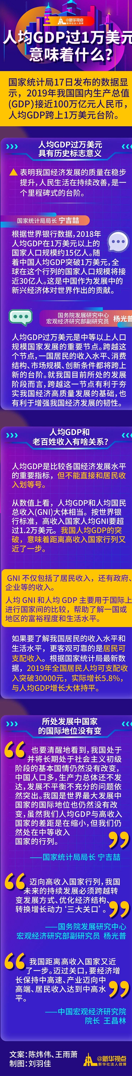 經(jīng)濟(jì)總量接近100萬(wàn)億元、人均國(guó)內(nèi)生產(chǎn)總值突破1萬(wàn)美元,國(guó)家統(tǒng)計(jì)局17日發(fā)布的2019年中國(guó)經(jīng)濟(jì)成績(jī)單,凸顯中國(guó)經(jīng)濟(jì)里程碑式的新跨越。