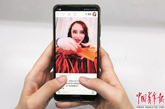 一位消費者在查看手機(jī)里關(guān)于網(wǎng)紅食品的視頻。中青報·中青網(wǎng)記者 李崢苨/攝