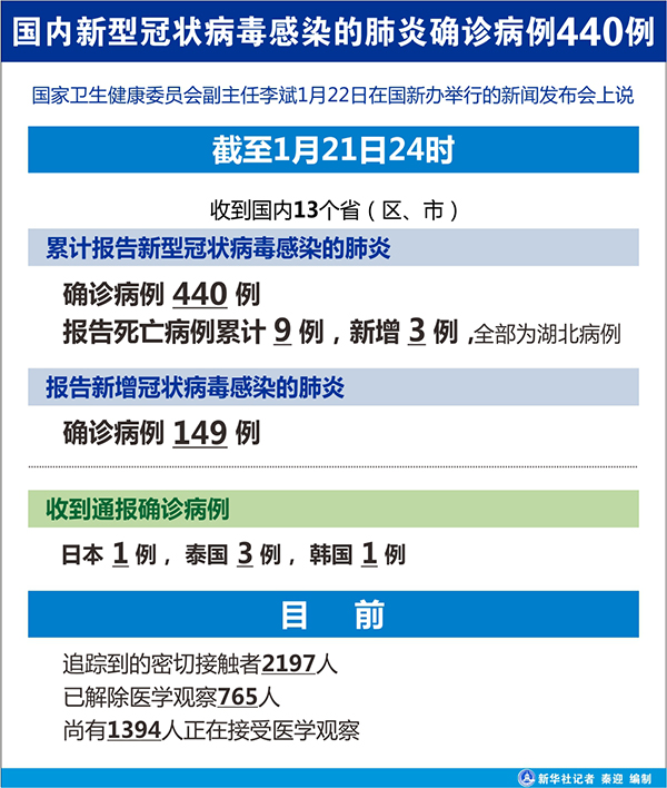 截至1月21日24時(shí),國(guó)家衛(wèi)健委收到國(guó)內(nèi)13個(gè)?。▍^(qū)、市)累計(jì)報(bào)告新型冠狀病毒感染的肺炎確診病例440例,報(bào)告死亡病例累計(jì)9例,新增3例,全部為湖北病例。