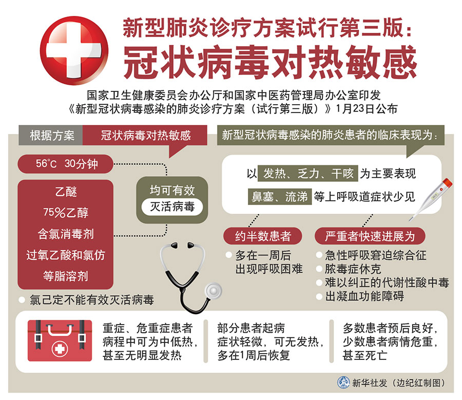 新華社北京1月23日電(記者田曉航、王秉陽(yáng))為進(jìn)一步指導(dǎo)全國(guó)科學(xué)規(guī)范做好新型冠狀病毒感染的肺炎病例診斷和醫(yī)療救治工作,在組織專家對(duì)診療方案進(jìn)行修訂基礎(chǔ)上,國(guó)家衛(wèi)生健康委員會(huì)辦公廳和國(guó)家中醫(yī)藥管理局辦公室印發(fā)《新型冠狀病毒感染的肺炎診療方案(試行第三版)》,23日公布。方案涉及冠狀病毒病原學(xué)特點(diǎn)、此次疫情的臨床特點(diǎn)、病例定義、鑒別診斷、病例的發(fā)現(xiàn)與報(bào)告等方面內(nèi)容,給出了包括中醫(yī)治療在內(nèi)的治療方案。