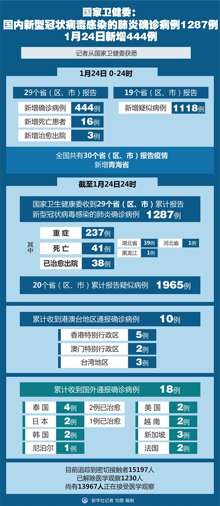 新華社北京1月25日電(記者王秉陽、田曉航)記者從國家衛(wèi)健委獲悉,1月24日0-24時,29個?。▍^(qū)、市)報告新增確診病例444例,新增死亡患者16例。新增治愈出院3例。19個省(區(qū)、市)報告新增疑似病例1118例。全國共有30個?。▍^(qū)、市)報告疫情,新增青海省。