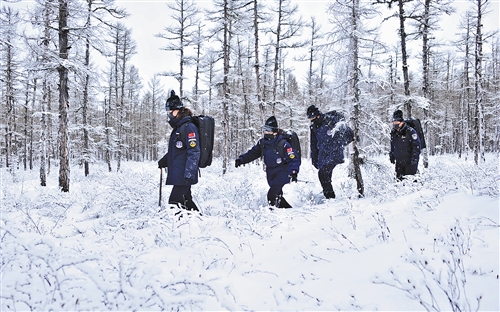 1月24日,內(nèi)蒙古阿龍山森林公安局“90后”女森林警察李慧與同事在大興安嶺原始林區(qū)踏雪巡邏。當(dāng)日最低氣溫降至-46℃,極低的氣溫使民警們的圍巾、帽子結(jié)滿冰霜。她們守護(hù)著大興安嶺腹地森林,每天驅(qū)車近百公里,徒步30余公里,保護(hù)著轄區(qū)內(nèi)的野生動植物資源,維護(hù)著林區(qū)社會治安秩序。 王 偉攝(中經(jīng)視覺)