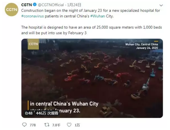 昨晚,CGTN在推特發(fā)布的一條關于武漢火神山醫(yī)院工地施工現(xiàn)場的視頻一舉沖上該平臺國際新聞首頁熱門,觀看量超446萬,超過153萬的全球網友參與互動。