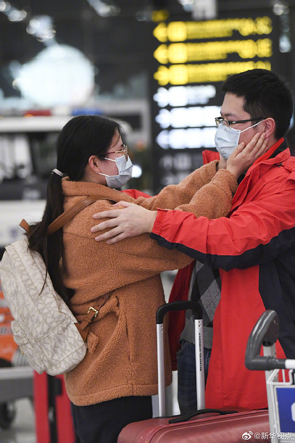 1月26日,重慶市醫(yī)療隊隊員、重慶醫(yī)科大學(xué)附屬第一醫(yī)院呼吸內(nèi)科主治醫(yī)師蔣磊同未婚妻高佳在重慶江北國際機場道別。兩人原定于2月2日領(lǐng)結(jié)婚證,但現(xiàn)在只能推遲了。“雖然我很擔(dān)心他,也很舍不得他,但我還是鼓勵他去好好工作”,高佳說,“我們現(xiàn)在計劃改在5月20日再去領(lǐng)證,我希望他加油,我等我的英雄勝利歸來”。他們的短暫離別,將換來更多人早日團(tuán)聚。26日晚,130余名醫(yī)務(wù)工作者組成的重慶市醫(yī)療隊從重慶出發(fā),前往湖北省孝感市支援。(記者 王全超)