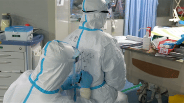 穿上隔離服的醫(yī)護(hù)人員只能露出一雙眼睛,誰(shuí)也認(rèn)不出對(duì)方,于是他們進(jìn)入隔離區(qū)的第一件事,就是相互在隔離服上寫(xiě)下對(duì)方的名字或者外號(hào),有時(shí)還會(huì)藝術(shù)創(chuàng)作一下,這成了隔離病房里“神秘的儀式”。