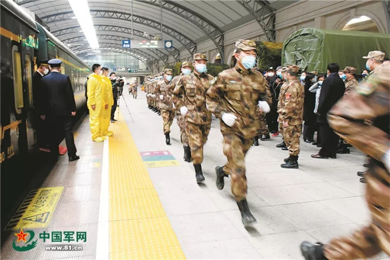 1月26日11時(shí)24分,T184列車載著解放軍緊急調(diào)撥的第一批防疫物資緩緩駛來,??吭跐h口火車站站臺(tái)。