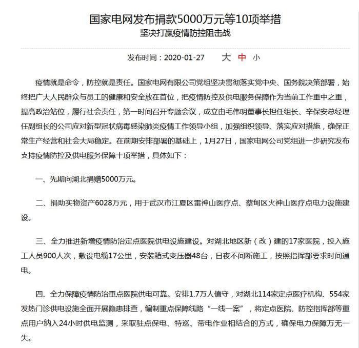 今日,國(guó)家電網(wǎng)在官方網(wǎng)站發(fā)布《國(guó)家電網(wǎng)發(fā)布捐款5000萬(wàn)元等10項(xiàng)舉措,堅(jiān)決打贏疫情防控阻擊戰(zhàn)》,要求全力確保民生用電,疫情防控期間,居民用電客戶采取欠費(fèi)不停電措施。