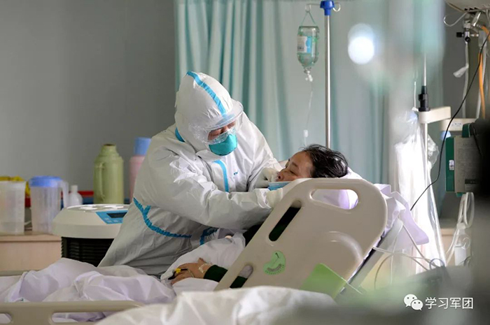1月27日上午,海軍軍醫(yī)大學(xué)醫(yī)療隊(duì)醫(yī)護(hù)人員在漢口醫(yī)院重癥監(jiān)護(hù)室對(duì)新型冠狀病毒感染的肺炎患者進(jìn)行救治。醫(yī)護(hù)人員耐心安撫患者。解放軍報(bào)記者范顯海攝
