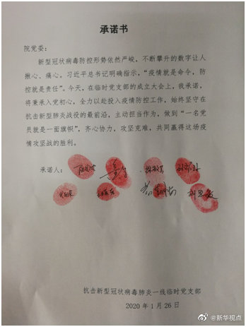 “我承諾,將秉承入黨初心,全力以赴投入疫情防控工作……”應(yīng)對疫情,湖北省中醫(yī)院新型冠狀病毒肺炎抗擊一線臨時(shí)黨支部成立。黨支部成員由感染科、肺病科、ICU、檢驗(yàn)科等醫(yī)、技、藥、護(hù)、行政、后勤等科室的66名黨員構(gòu)成。多名臨時(shí)黨支部成員還簽下承諾書,表示將主動擔(dān)當(dāng)作為,做到“一名黨員就是一面旗幟”。(記者 梁建強(qiáng))