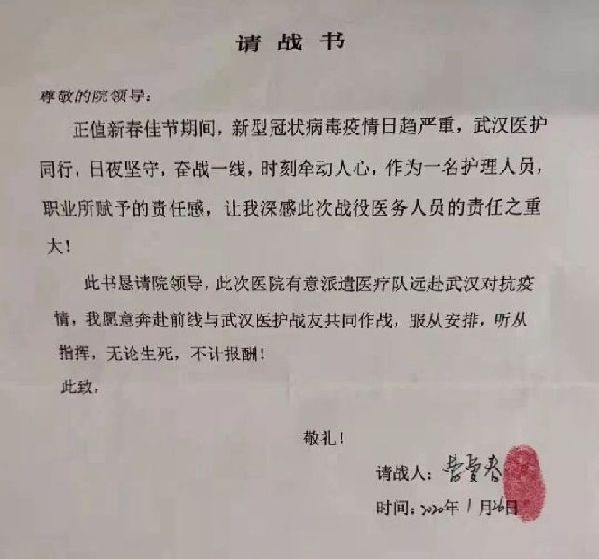 甘肅省定西市人民醫(yī)院新生兒科護(hù)士長曹愛春和護(hù)士邢亞半夜寫下請戰(zhàn)書,懇請院方批準(zhǔn)奔赴一線。落款時,兩人寫了八個字:無論生死,不計報酬。(定西市人民醫(yī)院供圖)