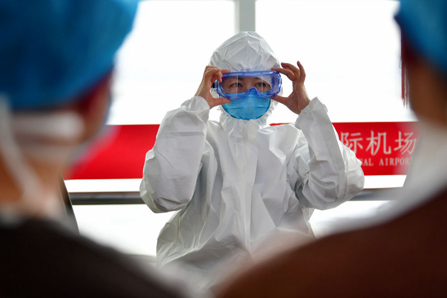 1月28日,甘肅中醫(yī)藥大學(xué)附屬醫(yī)院重癥醫(yī)學(xué)科護(hù)士長徐小艷(中)在出發(fā)前為同伴演示防護(hù)裝備穿戴。新華社記者 陳斌 攝