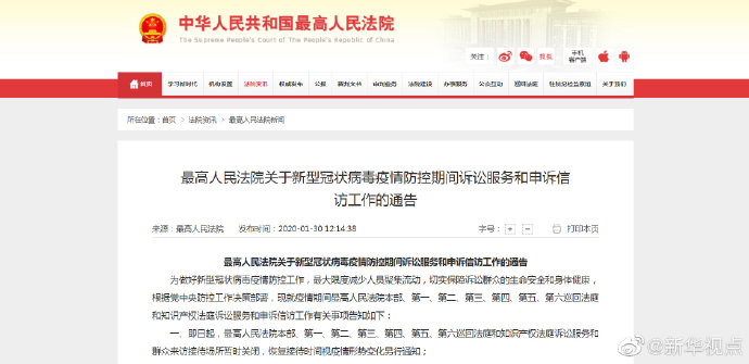 最高人民法院30日發(fā)布通告,即日起,最高人民法院本部、第一、第二、第三、第四、第五、第六巡回法庭和知識(shí)產(chǎn)權(quán)法庭訴訟服務(wù)和群眾來(lái)訪接待場(chǎng)所暫時(shí)關(guān)閉,恢復(fù)接待時(shí)間視疫情形勢(shì)變化另行通知;當(dāng)事人需要提交申請(qǐng)?jiān)賹彶牧稀⑸暝V信訪或者申請(qǐng)其他訴訟服務(wù)事項(xiàng)的,請(qǐng)通過(guò)最高人民法院訴訟服務(wù)網(wǎng)或者郵寄方式提交,查詢咨詢事項(xiàng)可撥打12368訴訟服務(wù)熱線聯(lián)系辦理。(記者羅沙)?
