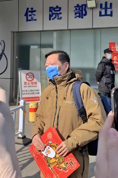 今天,記者在地壇醫(yī)院住院部出入口看到剛剛走出病房的王廣發(fā),他戴著藍色口罩,看上去精神狀態(tài)不錯,守候在門口的醫(yī)生還送上了代表“吉祥”的紅色貼畫。