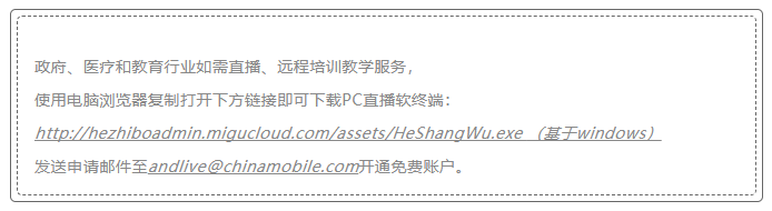中國移動(dòng)教育名師直播課堂免費(fèi)提供在線課程學(xué)習(xí)和遠(yuǎn)程直播教學(xué)平臺(tái),掃碼可領(lǐng)取可免費(fèi)課程資源,使用直播能力可撥打4001100868。中國移動(dòng)企業(yè)和商務(wù)直播為政府、醫(yī)療和教育行業(yè)提供直播、遠(yuǎn)程培訓(xùn)教學(xué)服務(wù),符合條件的用戶可使用直播普及疫情防控知識(shí),或使用電腦進(jìn)行遠(yuǎn)程培訓(xùn)教學(xué)等。