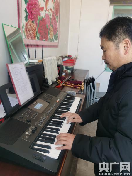 崔建存彈電子琴,琴架上有他從網(wǎng)上自己手抄的20多頁(yè)歌曲簡(jiǎn)譜(央廣記者 柴華 攝)