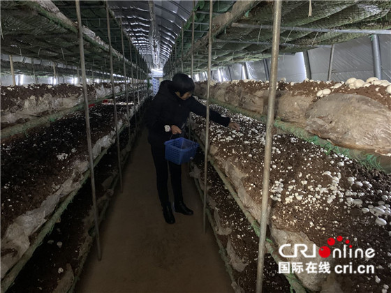 一大早,姚素瓊正在蘑菇房里摘蘑菇。閭陳雨 攝