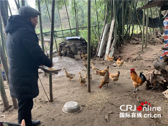 老伴汪學(xué)超正在喂雞。閭陳雨 攝