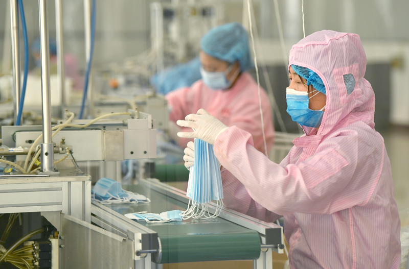 為助力抗擊新型冠狀病毒感染的肺炎疫情,陜西省西安市10家生產防護消毒用品的單位已緊急召回、招聘員工,滿負荷生產,以保障口罩、消毒液等防護消毒用品的穩(wěn)定供給。圖為1月29日,西安市鄠邑區(qū)一公司員工在制作口罩。