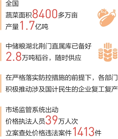 連日來,各部門積極組織蔬菜等副食品生產(chǎn),確保蔬菜、肉蛋奶、糧食等居民生活必需品供應,加強統(tǒng)籌協(xié)調(diào),保障煤電油氣供應。同時,依法嚴厲打擊利用疫情哄抬物價、囤積居奇、趁火打劫等擾亂社會秩序的違法犯罪行為。目前,全國生活必需品市場供應總體充足、價格穩(wěn)定。全國路網(wǎng)保障和運行良好,物資運輸整體有序。
