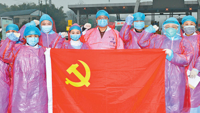 2月5日,在湖南益陽市高速公路鄧石橋出口,參與對乘車人進(jìn)行體溫監(jiān)測的康雅醫(yī)院黨員重溫入黨誓詞。為發(fā)揮黨員的模范帶頭作用,益陽各交通要道路口、車站卡口工作人員成立了臨時黨支部,設(shè)立了黨員示范崗。宣國祥攝(人民視覺)