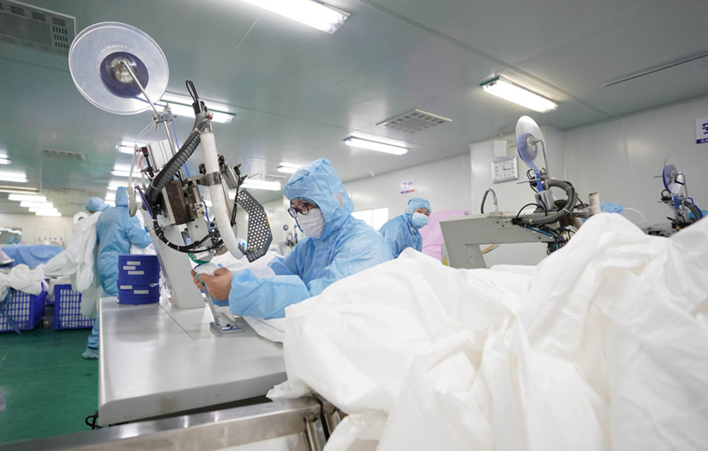 1月28日,在武漢市新洲區(qū)武漢協(xié)卓衛(wèi)生用品有限公司,工人在趕制防護服。