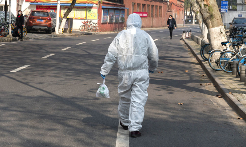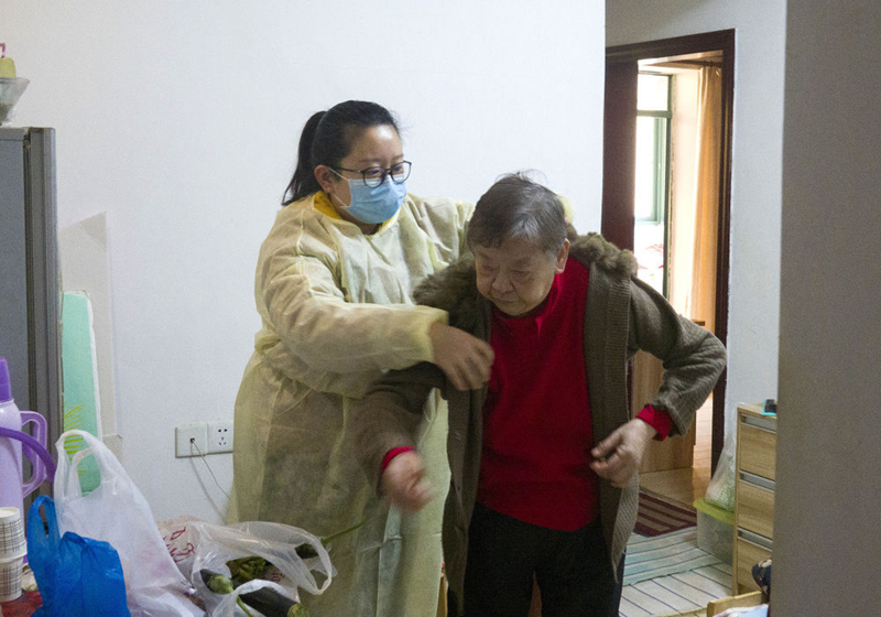 2月5日,武漢市江岸區(qū)永清街道吉林社區(qū)工作人員張敏為老伴住院的獨居老人送藥。