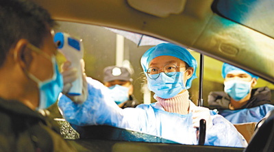 在廣西來賓市某高速公路出口,醫(yī)護(hù)人員為司機(jī)監(jiān)測(cè)體溫。高如金攝(人民視覺)