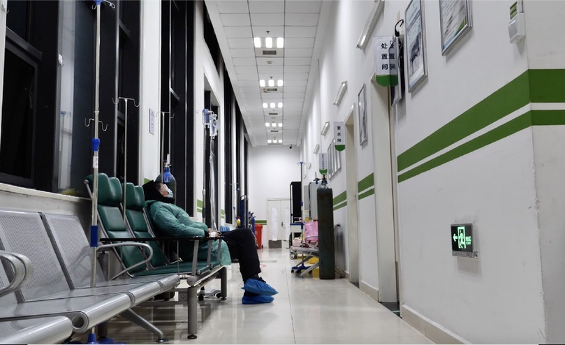 晚上十點鐘,發(fā)熱門診里僅能聽見護士的腳步聲,患者的咳嗽與喘氣聲。留觀室大多數(shù)病人已經(jīng)入睡,但有一位戴著棗紅色帽子的老爺爺,他插著氧氣管仍坐著,捧著手機看電視劇。