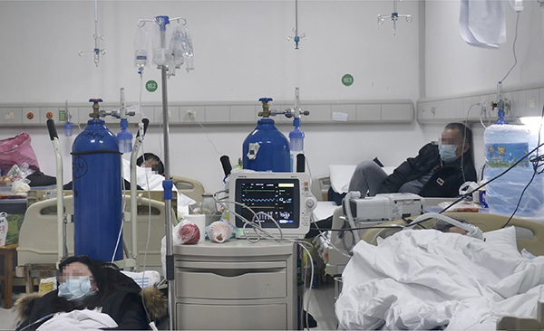留觀室里的患者,幾乎每個人身邊立著一個近一人高的氧氣鋼瓶,更有病情嚴重者用上了呼吸機。他們大多數(shù)人坐在病床上,時而躺下,沒有交談。有的患者見到醫(yī)生時會哭泣;有的患者吸著氧,靜靜地發(fā)呆,眼睛沒有神。
