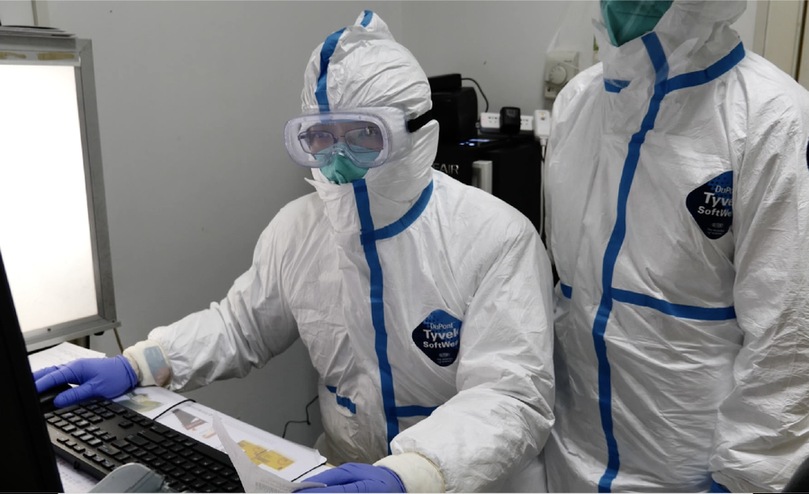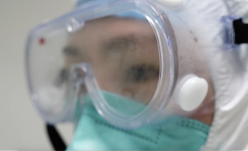 三層外科手套、一層頭套、一副面屏外加防護服,從醫(yī)護人員通道進入隔離通道,才進入工作區(qū)域。