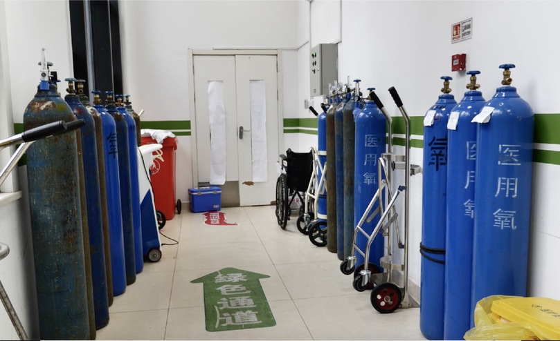 配藥、打針、換氧氣罐是護士們的日常工作。一位護士推著比她高出一個頭的氧氣鋼罐,挪到患者身旁。