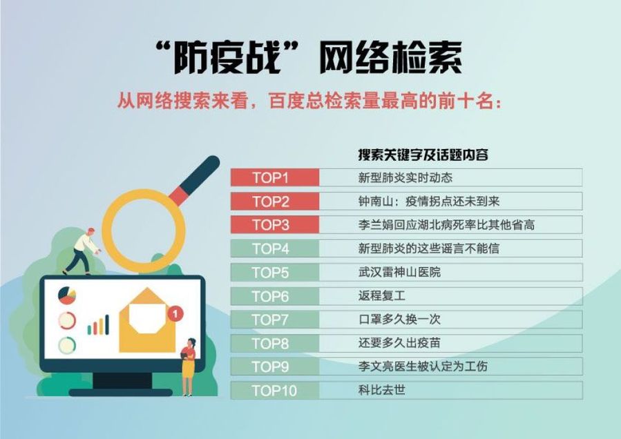 在百度搜索平臺(tái),日均超過10億人次搜索與“新冠肺炎”疫情有關(guān)的消息?!扮姞敔敗薄ⅰ袄钅棠獭钡陌l(fā)言最受關(guān)注,排名熱搜前列。