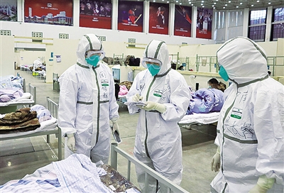 2月8日,醫(yī)務(wù)人員在武漢客廳方艙醫(yī)院查房。新華社發(fā)