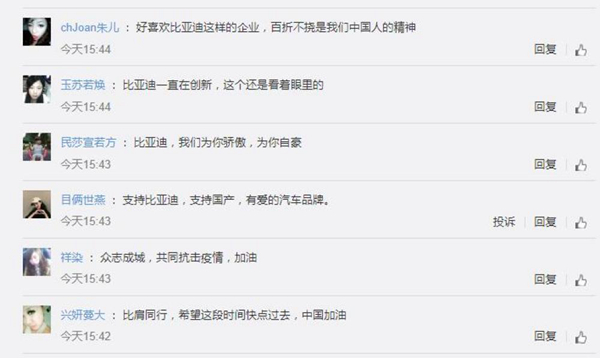 對(duì)于比亞迪汽車跨界造口罩一事,網(wǎng)友紛紛表示:“眾志成城,共同抗擊疫情”“百折不撓是中國人的精神”“希望這段時(shí)間快點(diǎn)過去,中國加油”。