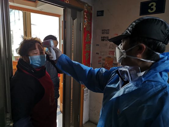 聞超在給社區(qū)居民測(cè)量體溫