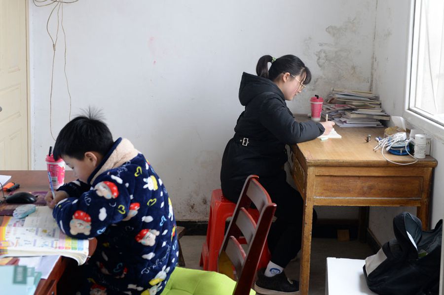 崔愛國和周超群的兩個孩子在衛(wèi)生室已消毒的隔間內(nèi)學習。(新華社記者黃博涵 攝)