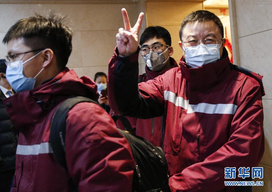 2月1日,中日友好醫(yī)院黨委書記周軍(右一)在出發(fā)前做出勝利的手勢。當(dāng)日,為進一步加強武漢新型冠狀病毒感染的肺炎危重癥患者救治工作,國家衛(wèi)生健康委緊急組派中日友好醫(yī)院、北京大學(xué)第一醫(yī)院、北京大學(xué)人民醫(yī)院、北京大學(xué)第三醫(yī)院院長或書記帶領(lǐng)本院重癥醫(yī)學(xué)科主任、護士長等專業(yè)人員奔赴武漢,和前期組派的專業(yè)醫(yī)務(wù)人員一起開展危重癥患者救治工作。 新華社記者 張玉薇 攝