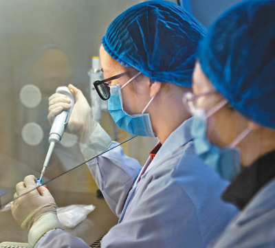重慶市長壽區(qū)疾病預(yù)防控制中心“90后”女檢測(cè)員文纖纖(左)、楊涵與病毒“零距離”對(duì)峙,持續(xù)戰(zhàn)斗在新型冠狀病毒PCR檢測(cè)室,為患者的診治爭(zhēng)取了寶貴時(shí)間。圖為兩位檢測(cè)員在提取化驗(yàn)結(jié)果。樊 強(qiáng)攝(人民視覺)