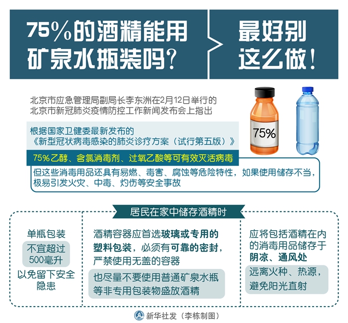 新華社北京2月13日電(記者丁靜)越來越多的人選擇常備75%的乙醇(俗稱酒精)進(jìn)行家庭和個人消毒。那么,75%的乙醇可以裝在礦泉水瓶里嗎?北京市應(yīng)急管理局副局長李東洲在12日舉行的北京市新冠肺炎疫情防控工作新聞發(fā)布會上稱,最好別這么做。