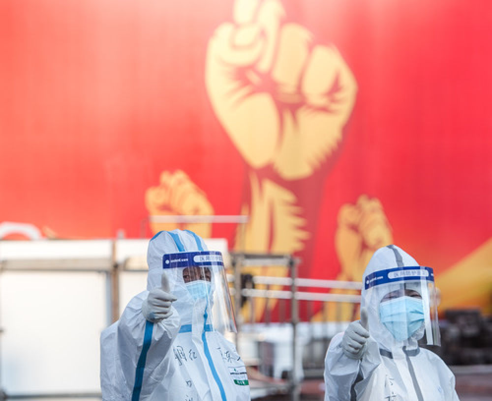 2月12日,兩名醫(yī)務(wù)人員在武漢體育中心方艙醫(yī)院前豎起拇指為自己和同伴加油鼓勁。 新華社記者 肖藝九 攝