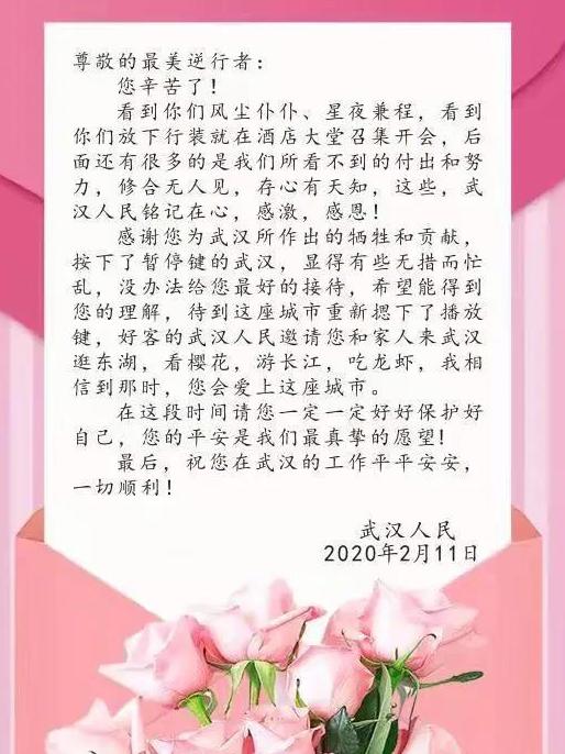 不久,華山醫(yī)院醫(yī)療隊回復道:這次,武漢人民需要幫助,我們責無旁貸地來了,來幫上一把!大家齊心協(xié)力,共渡難關。期待春暖花開,一起逛東湖、看櫻花、游長江、吃龍蝦!