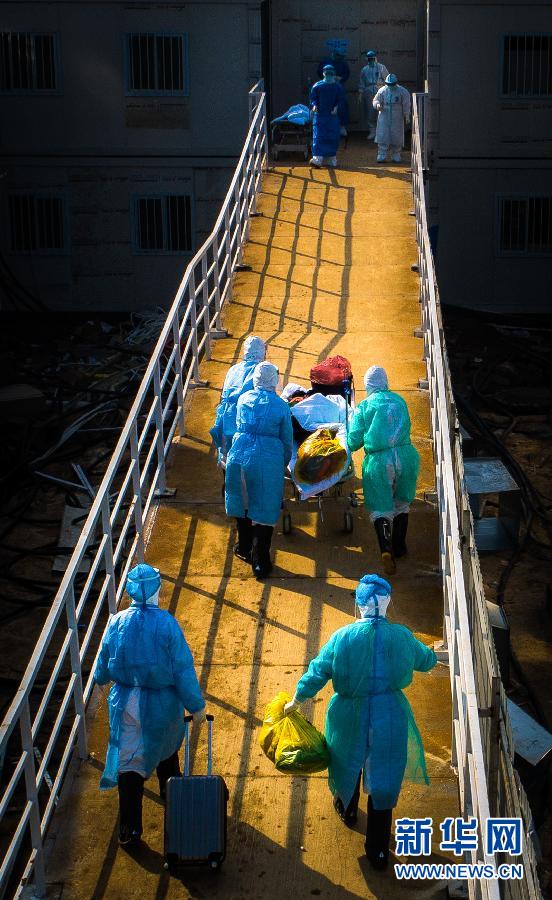 1月24日,武漢大學(xué)中南醫(yī)院重癥隔離病房的醫(yī)護(hù)人員將一名好轉(zhuǎn)的病人轉(zhuǎn)移至普通隔離病房。 新華社記者 熊琦 攝