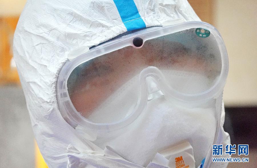1月29日,北京宣武醫(yī)院一名醫(yī)護(hù)人員在武漢駐地練習(xí)防護(hù)技能時護(hù)目鏡內(nèi)充滿霧氣。 新華社記者 才揚(yáng) 攝