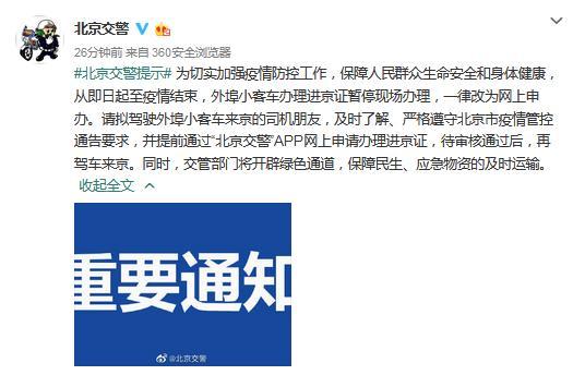 警方提醒,請擬駕駛外埠小客車來京的司機朋友,及時了解、嚴格遵守北京市疫情管控通告要求,并提前通過“北京交警”APP網(wǎng)上申請辦理進京證,待審核通過后,再駕車來京。同時,交管部門將開辟綠色通道,保障民生、應(yīng)急物資的及時運輸。