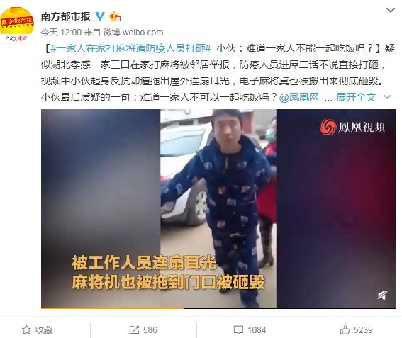 比如,一家三口在家里圍桌打麻將,突然有防疫工作人員進來,不由分說開始打砸,一位年輕人表示不服,竟被連抽幾個耳光;一位中年男子下樓買菜,進小區(qū)時拒絕登記,與工作人員產生沖突,最終被幾名工作人員摁倒在地;一位東北大娘在外溜達時沒戴口罩,與社區(qū)干部發(fā)生沖突,甚至拳腳相加,最終被戴上手銬抓進警車……
